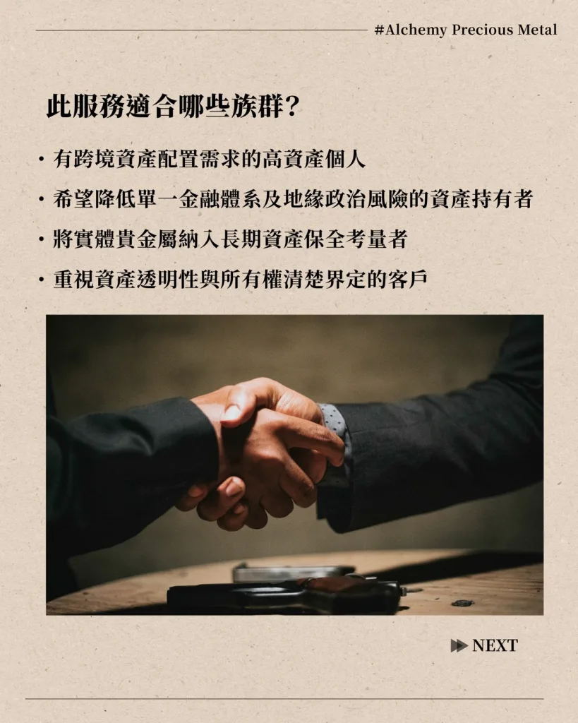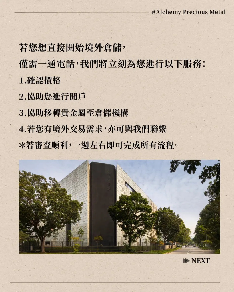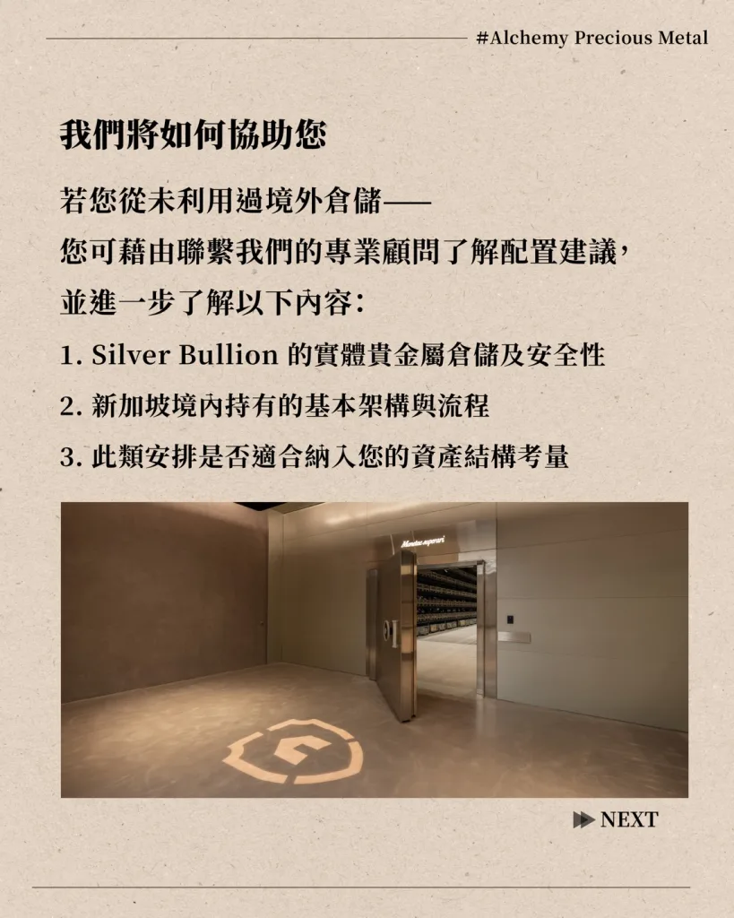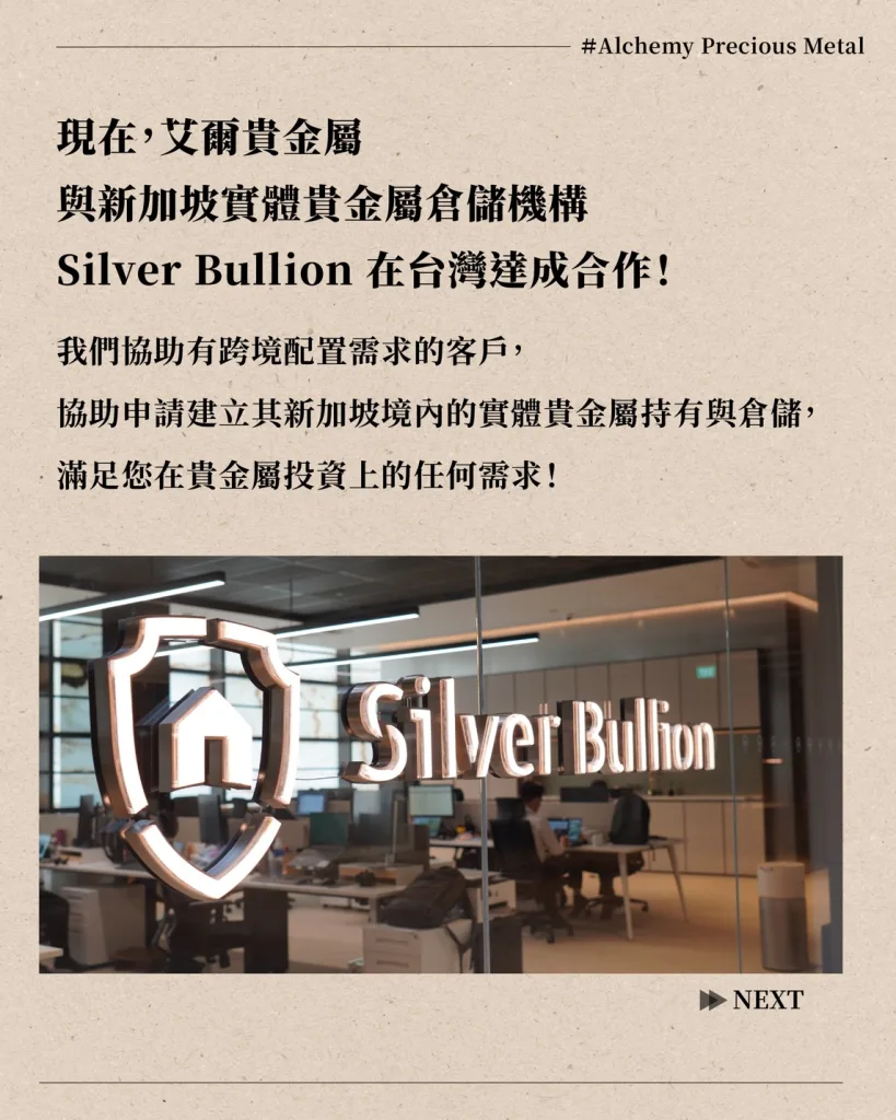 現在,艾爾貴金屬與新加坡實體貴金屬倉儲機構 Silver Bullion 在台灣達成合作,我們協助有跨境配置需求的客戶,協助申請建立其新加坡境內的實體貴金屬持有與倉儲,滿足您在貴金屬投資上的任何需求!