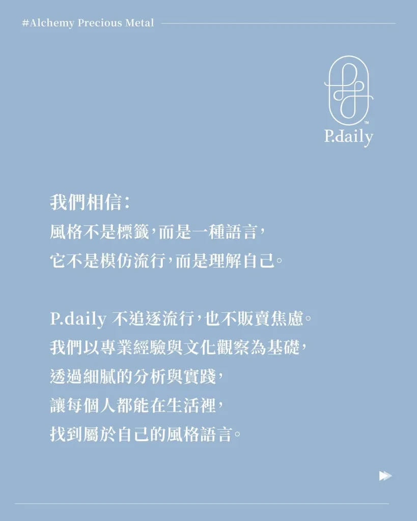 P.daily不追逐流行,也不販賣焦慮。我們以專業經驗與文化觀察為基礎,透過細膩的分析與實踐,讓每個人都能在生活裡,找到屬於自己的風格語言。