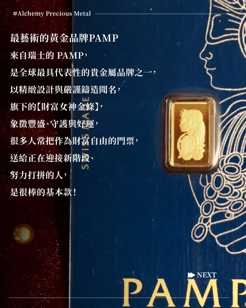 來自瑞士的 PAMP(Produits Artistiques Métaux Précieux),是全球最具代表性的貴金屬品牌之一,以精緻設計與嚴謹鑄造聞名,旗下的【財富女神金條】,象徵豐盛、守護與好運,很多人常把作為財富自由的門票,送給正在迎接新階段、努力打拼的人,是很棒的基本款!