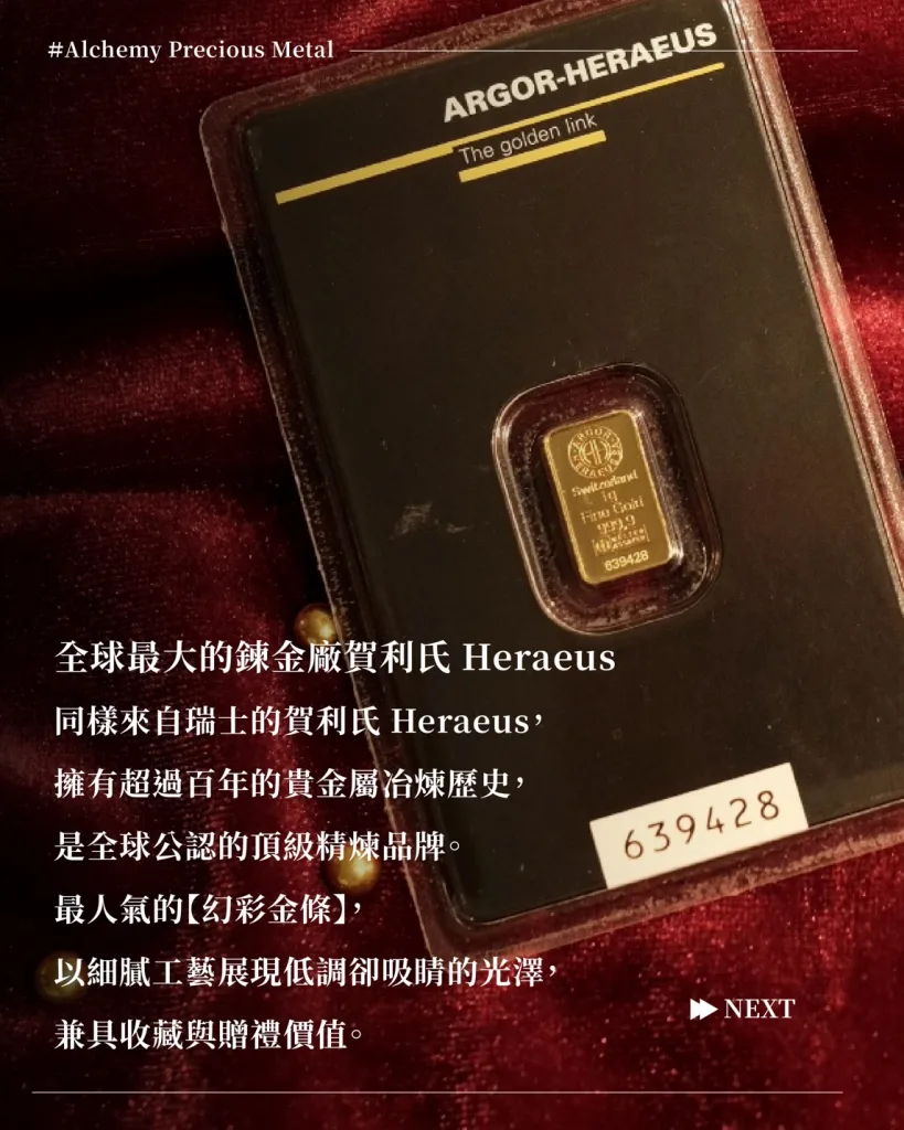 同樣來自瑞士的賀利氏 Heraeus,擁有超過百年的貴金屬冶煉歷史,是全球公認的頂級精煉品牌。最人氣的【幻彩金條】,以細膩工藝展現低調卻吸睛的光澤,兼具收藏與贈禮價值。