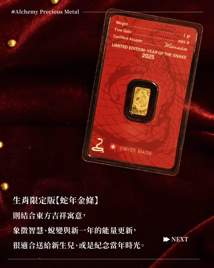 生肖限定版【蛇年金條】則結合東方吉祥寓意,象徵智慧、蛻變與新一年的能量更新,很適合送給新生兒、或是紀念當年時光。