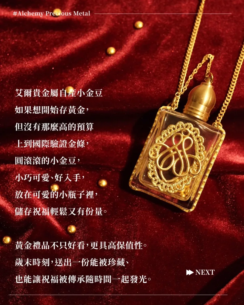 如果想開始存黃金,但沒有那麼高的預算上到國際驗證金條,圓滾滾的小金豆,小巧可愛、好入手,放在可愛的小瓶子裡,儲存祝福輕鬆又有份量。