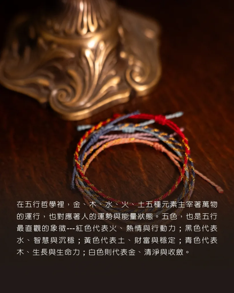 在五行哲學裡,金、木、水、火、土五種元素主宰著萬物的運行,也對應著人的運勢與能量狀態。五色,也是五行最直觀的象徵—紅色代表火、熱情與行動力;黑色代表水、智慧與沉穩;黃色代表土、財富與穩定;青色代表木、生長與生命力;白色則代表金、清淨與收斂。