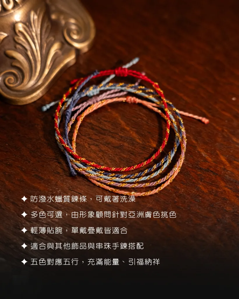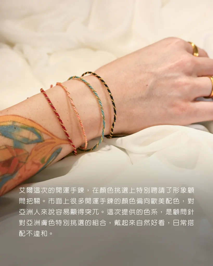 艾爾這次的開運手鍊,在顏色挑選上特別聘請了形象顧問把關。市面上很多開運手鍊的顏色偏向歐美配色,對亞洲人來說容易顯得突兀。這次提供的色系,是顧問針對亞洲膚色特別挑選的組合,戴起來自然好看,日常搭配不違和。
