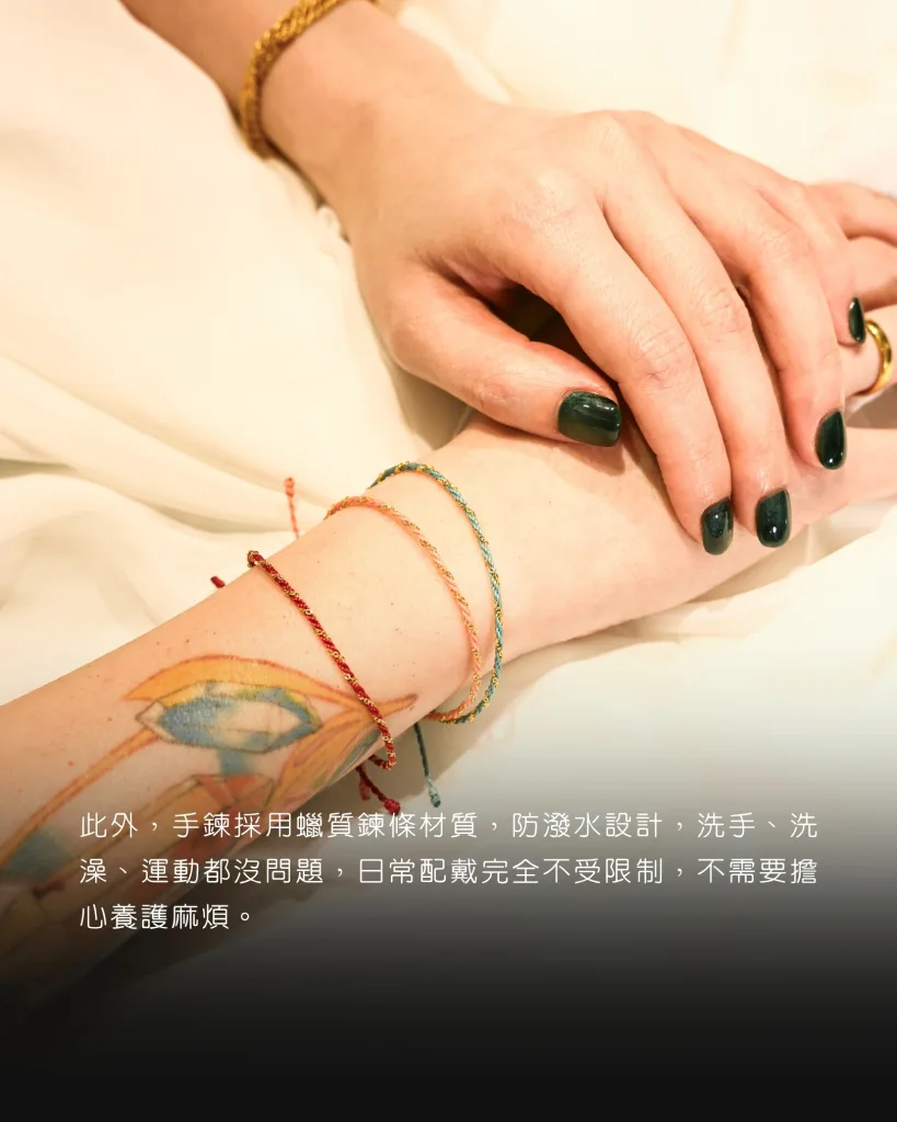 此外,手鍊採用蠟質鍊條材質,防潑水設計,洗手、洗澡、運動都沒問題,日常配戴完全不受限制,不需要擔心養護麻煩。
