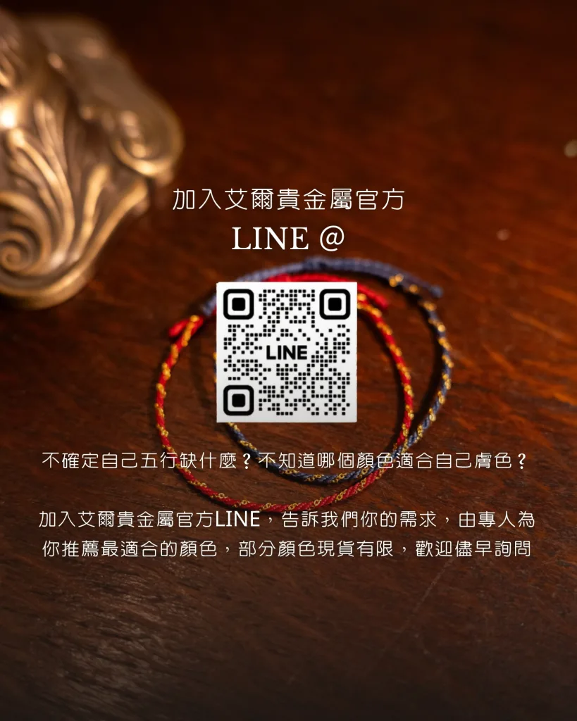 不確定自己五行缺什麼?不知道哪個顏色最適合自己的膚色?加入艾爾貴金屬官方LINE,告訴我們你的需求,由專人為你推薦最適合的顏色,部分顏色現貨有限,歡迎儘早詢問