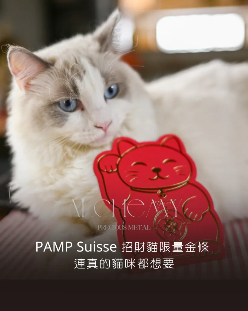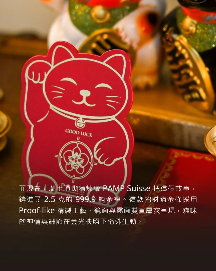而現在,瑞士頂尖精煉廠 PAMP Suisse 把這個故事,鑄進了 2.5 克的 999.9 純金裡。這款招財貓金條採用 Proof-like 精製工藝,鏡面與霧面雙重層次呈現,貓咪的神情與細節在金光映照下格外生動。
