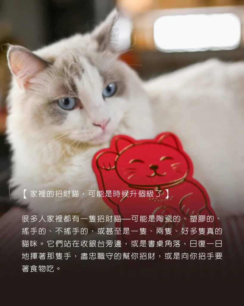 很多人家裡都有一隻招財貓—可能是陶瓷的、塑膠的、搖手的、不搖手的,或甚至是一隻、兩隻、好多隻真的貓咪。它們站在收銀台旁邊,或是書桌角落,日復一日地揮著那隻手,盡忠職守的幫你招財,或是向你招手要著食物吃。