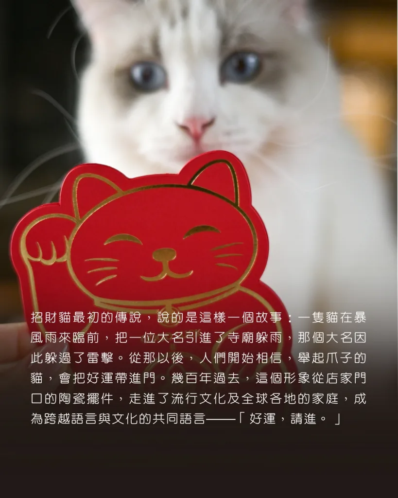 招財貓最初的傳說,說的是這樣一個故事:一隻貓在暴風雨來臨前,把一位大名引進了寺廟躲雨,那個大名因此躲過了雷擊。從那以後,人們開始相信,舉起爪子的貓,會把好運帶進門。幾百年過去,這個形象從店家門口的陶瓷擺件,走進了流行文化,走進了全球各地的家庭,成為跨越語言與文化的共同語言——「好運,請進。」