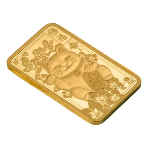 材質為 999.9 純金,重量 2.5 公克(0.0804 金衡盎司),條體尺寸 11.5 × 19 mm。由瑞士 MKS PAMP SA 鑄造,全球限量 18,888 枚,每條刻有獨立序號。隨附 CertiPAMP™ 檢驗卡(外形裁切為招財貓輪廓),具防拆驗真功能,另附招財貓造型禮品外袋。